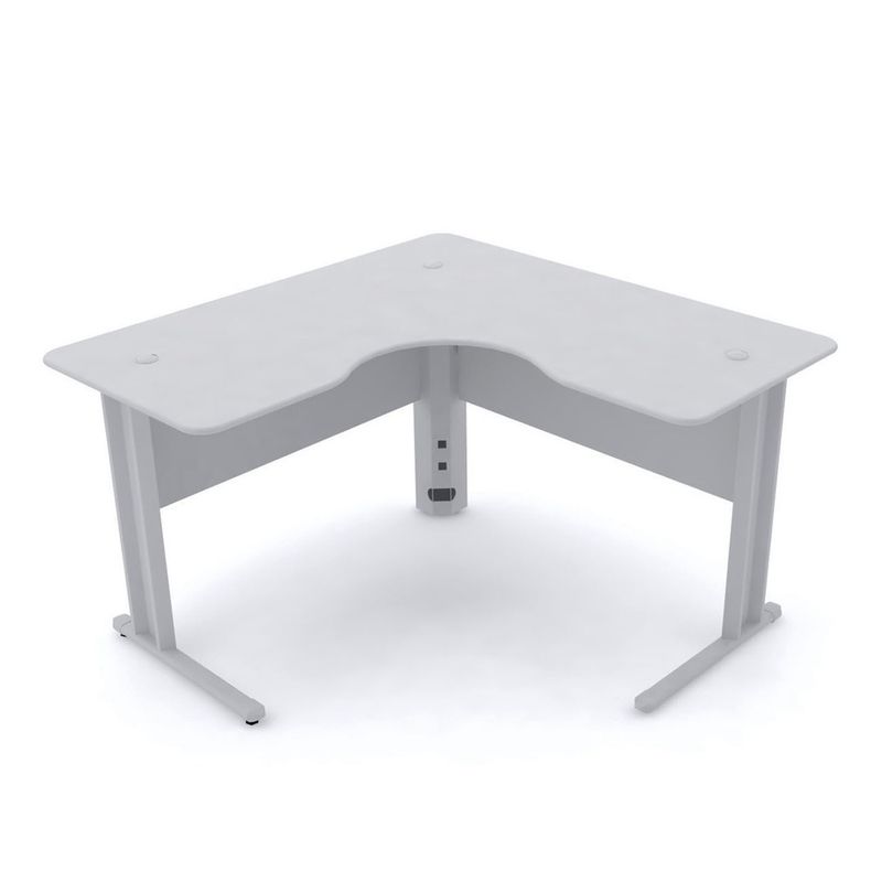 Mesa em "L" medindo 140x140 cm, confeccionada em madeira MDP-BP de 15 mm de espessura, com acabamento de bordas em perfil PVC flexível arredondado a 180 C na cor cinza cristal. Possui três orifícios no tampo para passagem de fios. Os pés são feitos em aço oblongo com tratamento antiferrugem e pintura eletrostática a pó, equipados com ponteiras rígidas de polipropileno na cor cinza. Inclui sapatilhas reguladoras de desnível de piso e calhas verticais nos pés para passagem de fios, garantindo funcionalidade e organização.