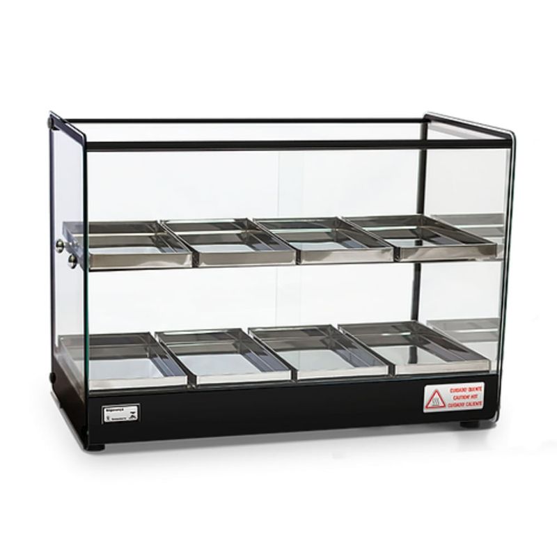 Estrutura fabricada em perfil de alumínio anodizado e aço inox; bandejas com dobras em aço inox; vidros laterais com serigrafia, tratados termicamente (não solta com temperatura); com todos os vidros temperados; termostato; resistência elétrica em aço inox 304 tubular; fiação elétrica com revestimento em silicone resistente a 300°C. A linha EVR, traz a referências do estilo retrô para o seu negócio. Seu design clean e compacto confere melhor visualização dos produtos, além de preserva-los quentes e saborosos.