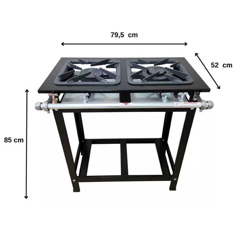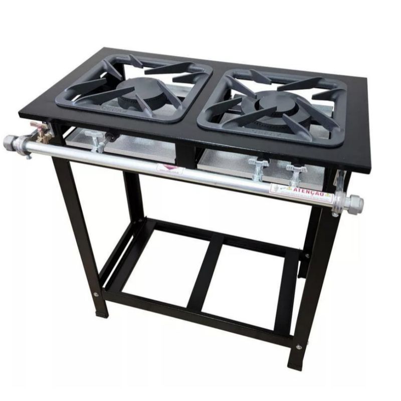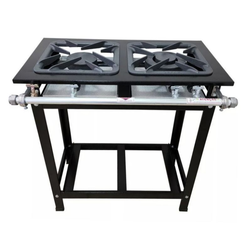 O fogão de 2 bocas, projetado para funcionamento a gás GLP de baixa pressão, possui uma estrutura robusta em aço carbono com pintura a pó eletrostática, garantindo durabilidade e resistência. Com uma grelha de ferro fundido de 30x30 cm e queimadores de alta eficiência (um simples e um duplo), ele oferece um consumo econômico de gás, sendo 0,175 kg/h para o queimador simples. O registro regulador Palito Durata assegura um controle preciso do fluxo de gás. Totalmente desmontável, facilita o transporte e armazenamento, e suas dimensões de 85 cm de altura, 80 cm de largura e 52 cm de comprimento o tornam ideal para diversas aplicações culinárias.