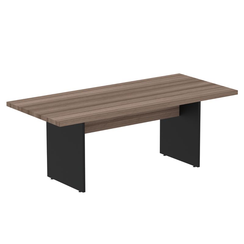 Esta grande mesa retangular tem tampo em madeira escura e pés pretos, com tudo o que é essencial para uma reunião confortável e memorável