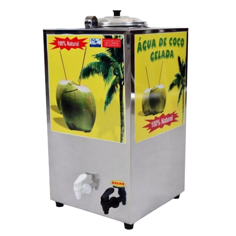 Este equipamento foi construído totalmente em aço inox e alumínio. As mangueiras que compõem o sistema são atóxicas, para que desta forma não transmita nenhum tipo de resíduo, cheiro ou sabor para a água. É prático, pois foi desenvolvido para facilitar o trabalho de quem utiliza o Gela Coco em áreas externas para venda de rua, com pouco consumo de gelo, não há necessidade de manter o coco gelado. O equipamento possui torneira para drenar a água formada pelo derretimento do gelo. Não precisa de energia elétrica para gelar a água do coco, fácil para limpar, o produto é compacto e de fácil mobilidade. O tanque comporta aproximadamente 15kg de gelo moído, que em nenhuma hipótese pode ser socado, quebrado ou jogado dentro do equipamento o que pode causar a quebra das torneiras e trincas da solda do tanque. Possui serpentina em alumínio que comporta aproximadamente 650 ml de água de coco, acompanha peneira para retenção de resíduos evitando entupimento de furador de coco em aço inox. As torneiras também recebem vedação para que não haja vazamento de água de gelo ou contaminando a água do coco, desde que sejam seguidas as orientações que constam no manual do usuário que acompanha o equipamento.