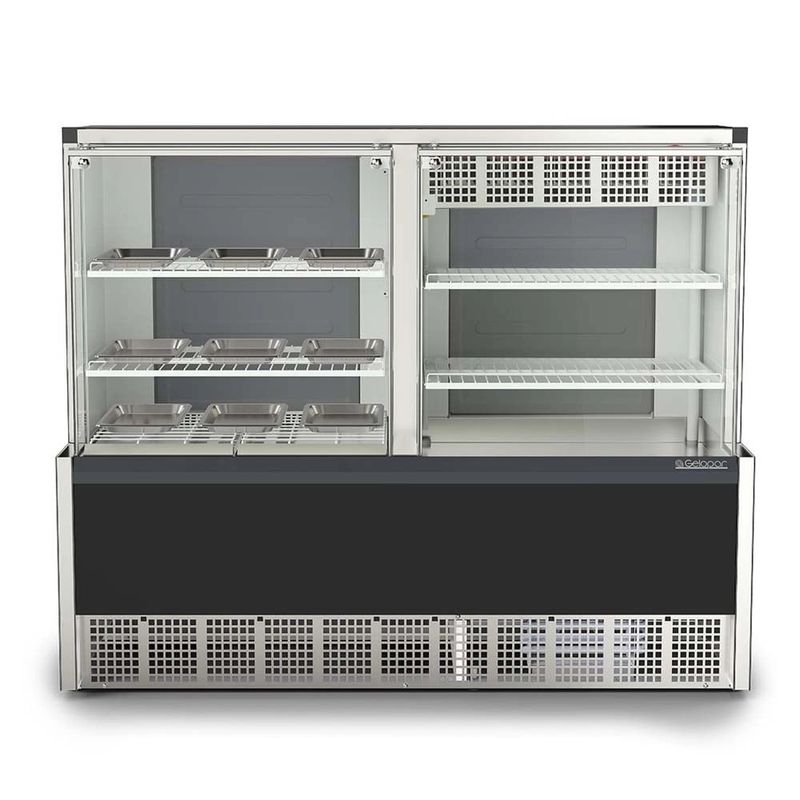 A Vitrine GQRA-140R PR faz parte da nova linha Aurora da Gelopar. Desenvolvida com o que há de mais moderno em tecnologia e design, a Vitrine foi projetada para uso misto, refrigerando bebidas, frios e laticínios de um lado, enquanto expões e mantém aquecidos salgados e outros alimentos quentes. A GQRA possui 2 controle de temperatura através de 2 termostatos, um para o lado aquecido (acima de 60°) e outro para o lado refrigerado de +1°C e 7°C. O aquecimento é feito através de resistência blindada e a refrigeração é estática com uma placa fria. A vitrine conta com iluminação em LED, acionada por interruptor, pés reguláveis para melhor ajuste em qualquer tipo de piso, degelo manual e vidros temperados (sujeitos a condensação da umidade do ar) . Acompanha 9 bandejas em aço inox 304 para salgados.
